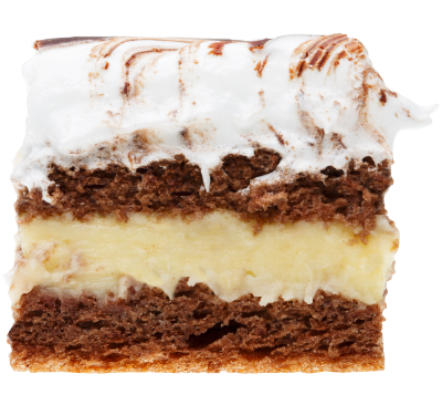 Pandispan pufos de cacao, crema fina de vanilie cu unt, decor bezea/meringue si glazura de ciocolata. Modelul ce rezulta in urma combinarii meringue-ului cu glazura are forma unei cozi de paun.