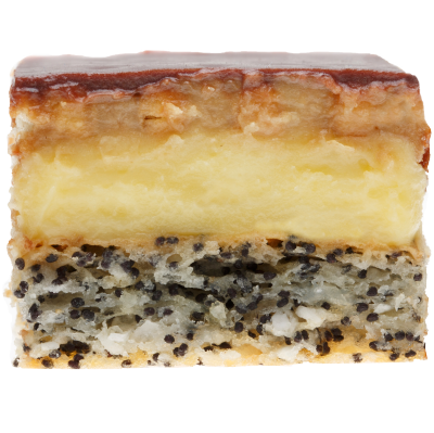 Blat pufos cu mac, crema fina de vanilie cu unt si un strat subtire de biscuite acoperit cu glazura de ciocolata.
